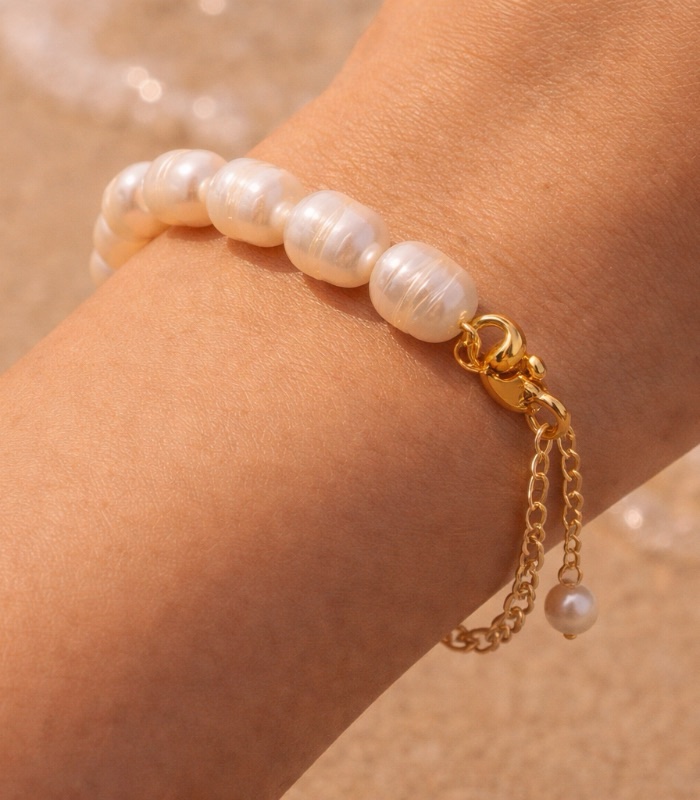 Doğal inci dokusuyla tasarlanan bu bileklik, yaz kombinlerinin vazgeçilmezi olmaya aday. Deniz, kum ve güneşin enerjisini stiline taşı 💫