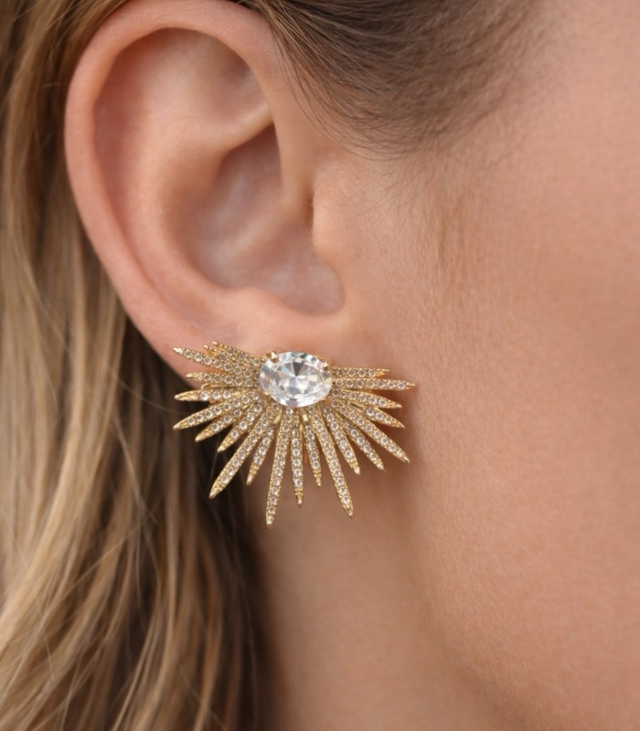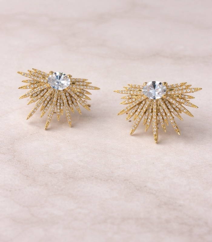 Altın tonlu güneş formuyla dikkat çeken zarif bir küpe.