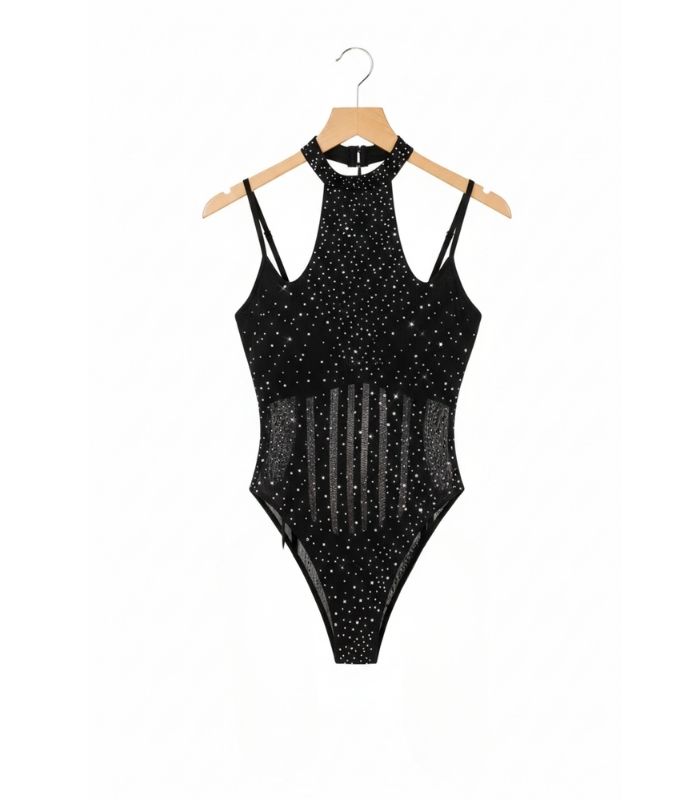 Taşlı yıldız detayı ve dekolte formuyla dikkat çekici bir body suit.