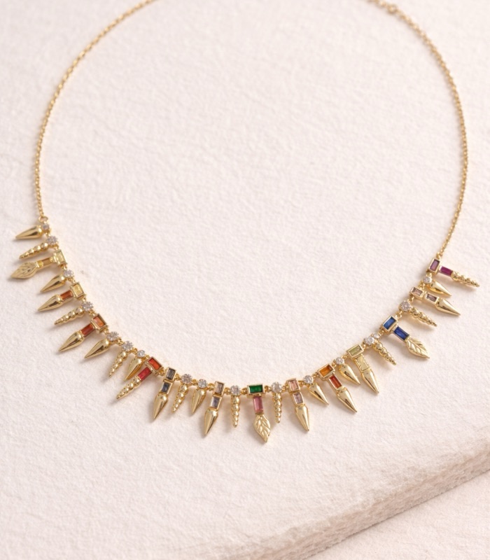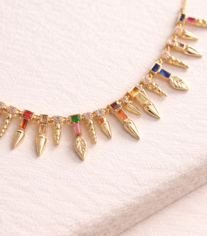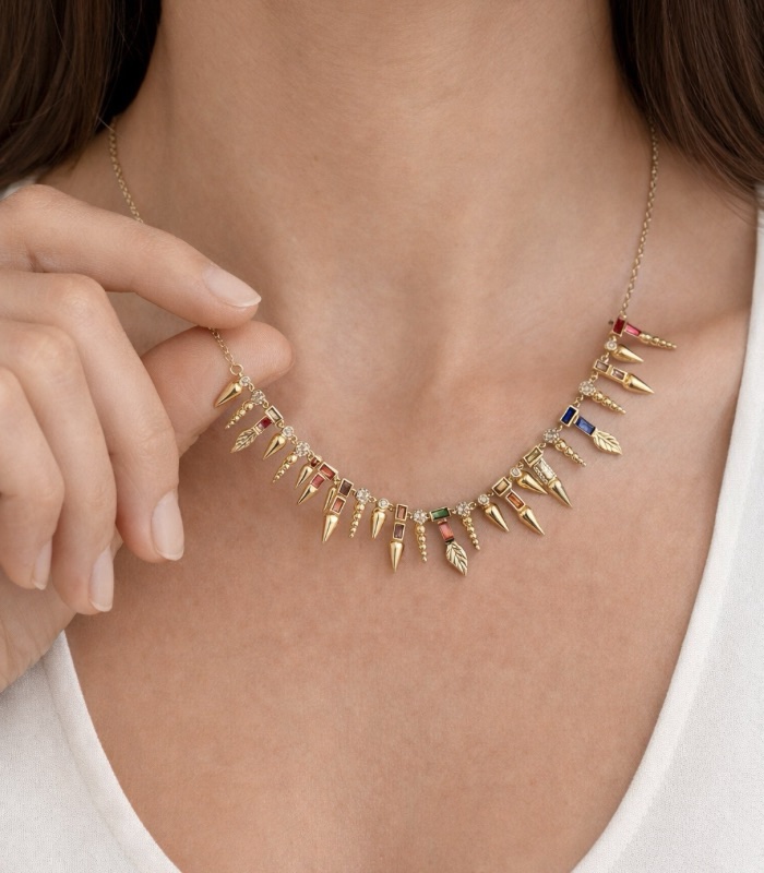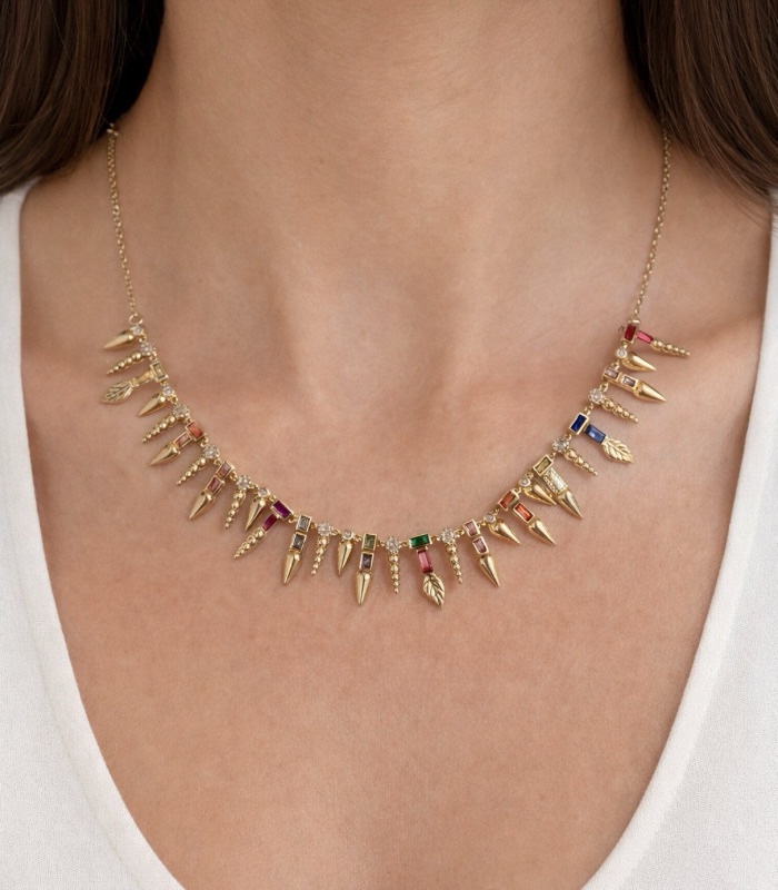 Taş detaylı Y formuyla boyun hattında zarif bir duruş sağlayan dengeli bir tasarım.
